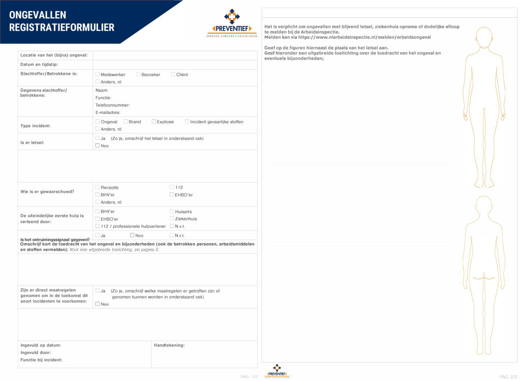 Nog geen registratieformulier voor ongevallen binnen uw organisatie? Download via onderstaande link ons voorbeeld ongevallenformulier.